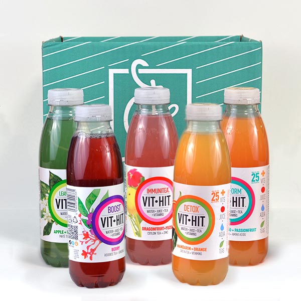Vit-Hit Bebidas que combinan agua, zumos naturales, té infusionado y vitaminas, con sabores refrescantes y un enfoque de bienestar.